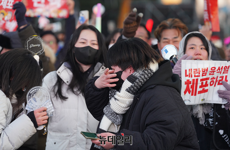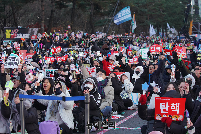 윤석열 대통령 탄핵소추안 2번째 표결일인 14일 오후 국회의사당 앞에서 열린 탄핵찬성 집회에서 참가자들이 환호하고 있다.