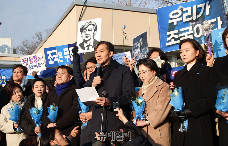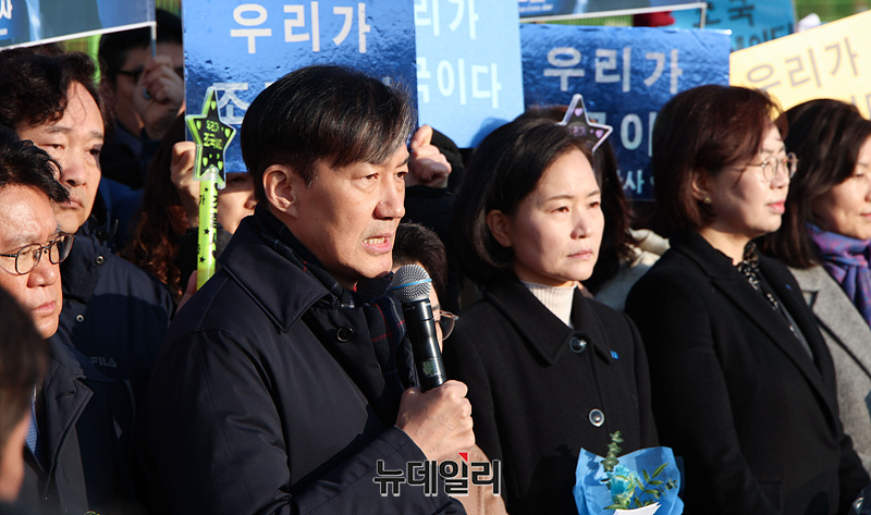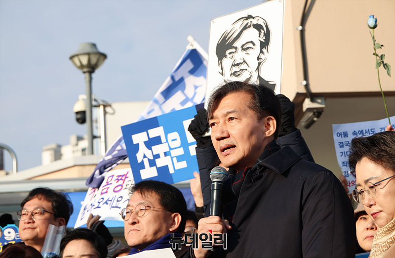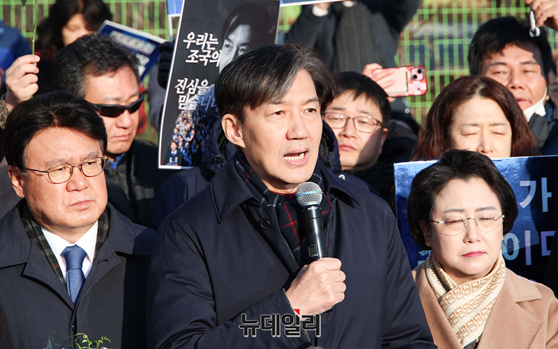 자녀 입시 비리와 청와대 감찰 무마 혐의로 대법원으로부터 징역 2년 실형을 확정받은 조국 전 조국혁신당 대표가 16일 오전 경기 의왕 서울구치소에 수감되기 전 지지자들에게 발언하고 있다. (경기 의왕=서성진 기자)
