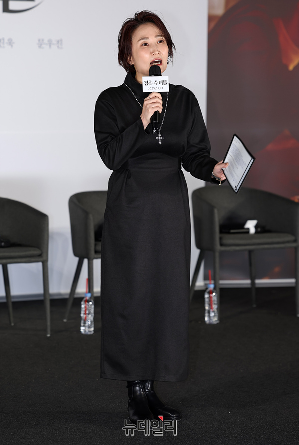 박경림이 16일 오전 서울 CGV용산 아이파크몰에서 열린 영화 '검은 수녀들(감독 권혁재)' 제작보고회에서 인사말을 하고 있다.'검은 수녀들'은 '검은 사제들'에 이은 영화로 강력한 악령에 사로잡힌 소년을 구하기 위해 금지된 의식에 나서는 사람들의 이야기를 그린다. 구마 사제가 부재한 상황에서 구마가 허락되지 않은 수녀들이 금지된 의식에 나선다는 차별화된 설정으로 시작한다.배우 송혜교, 전여빈, 이진욱, 문우진 등이 출연한다. 내년 1월 24일 극장 개봉.