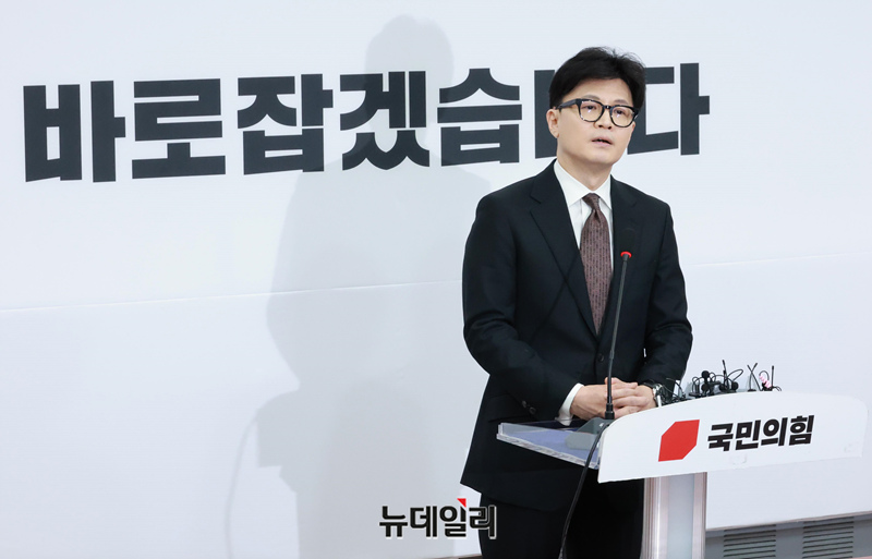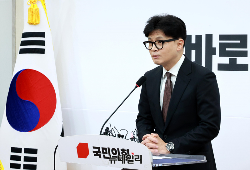 한동훈 국민의힘 당대표가 16일 오전 국회에서 당대표직 사퇴 발표 기자회견을 하고 있다.