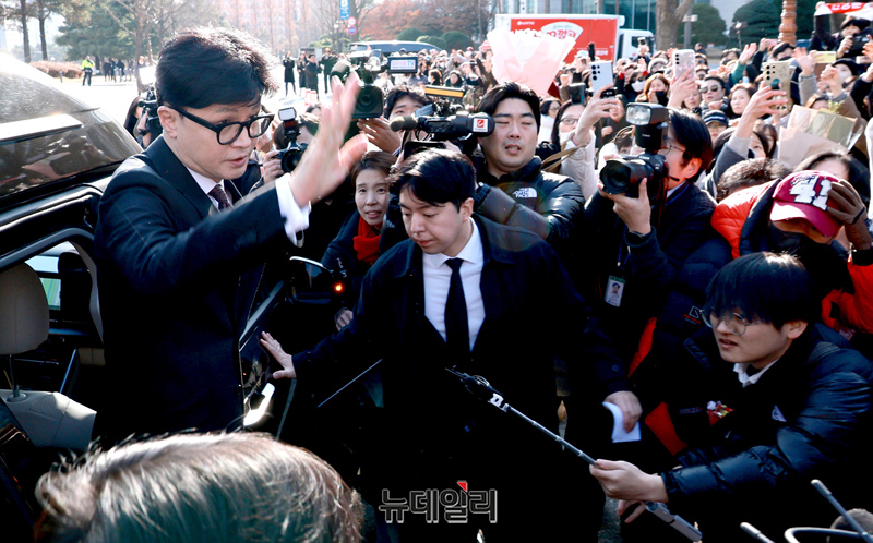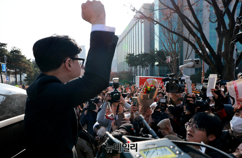 한동훈 국민의힘 대표가 16일 국회에서 당대표 사퇴 기자회견을 마치고 이동하던 중 지지자들에게 인사를 하고 있다.