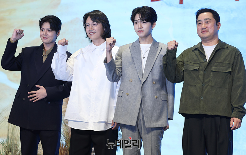 강민구 감독과 주연배우들이 16일 오후 서울 구로구 디큐브시티에서 열린 지니 TV 오리지널 '나미브(연출 한상재 강민구)' 제작보고회에서 포즈를 취하고 있다.