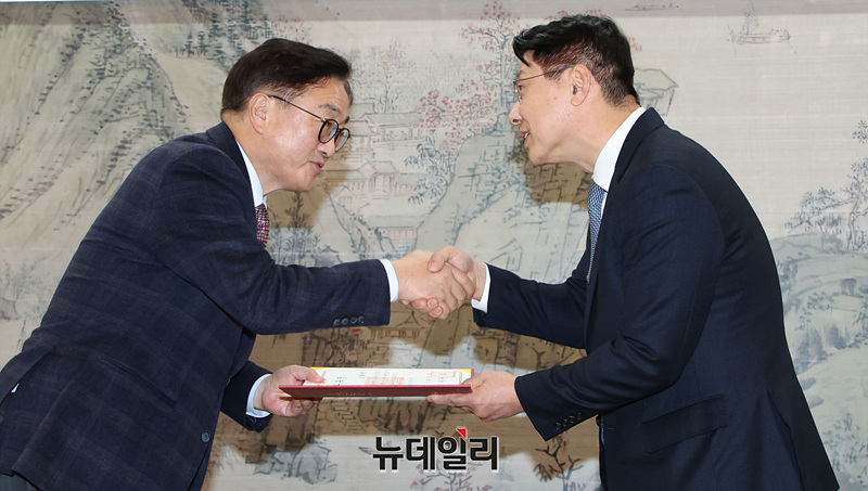 우원식 국회의장이 16일 오후 서울 여의도 국회에서 열린 '위헌적 비상계엄 선포를 통한 내란 행위의 진상규명을 위한 특별검사 후보 추천위원 위촉식'에서 김형연 전 법제처장에게 위촉장을 수여하고 있다.