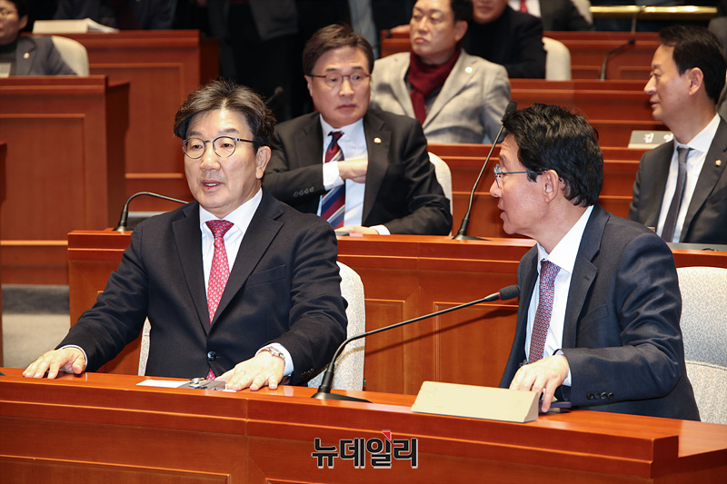권성동 국민의힘 원내대표와 김상훈 정책위의장이 16일 오후 서울 여의도 국회에서 열린 의원총회에서 대화를 나누고 있다.