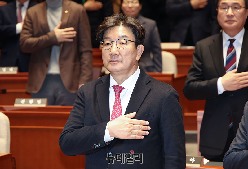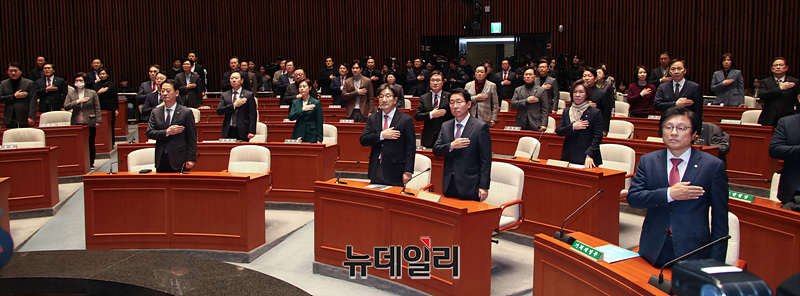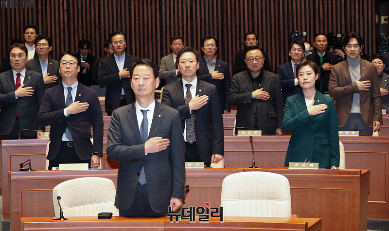 권성동 국민의힘 원내대표를 비롯한 의원들이 16일 오후 서울 여의도 국회에서 열린 의원총회에서 국민의례를 하고 있다.