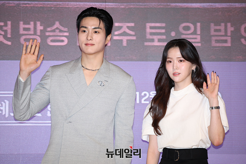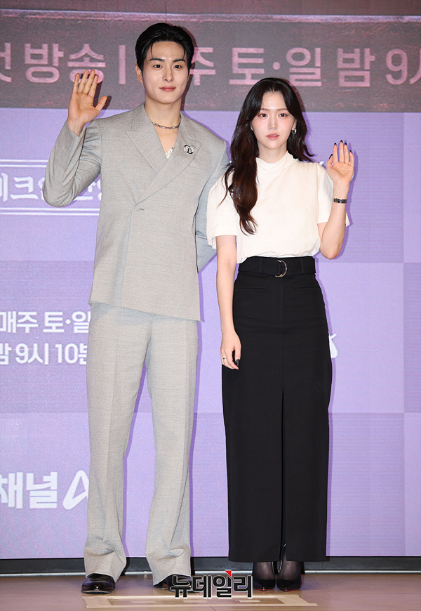 배우 정건주와 김지은이 17일 오전 서울 강남구 엘리에나 호텔에서 열린 채널A 토일드라마 '체크인 한양' 제작발표회에서 포즈를 취하고 있다.