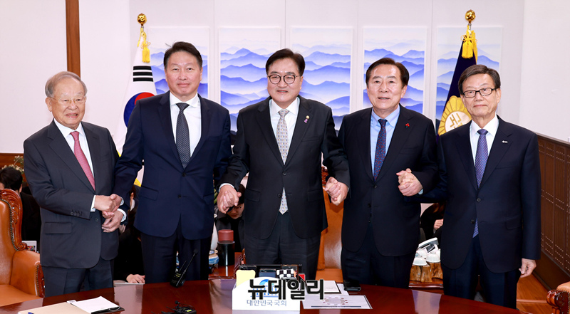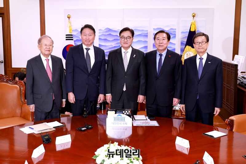 우원식 국회의장이 17일 국회 의장실에서 열린 경제4단체 비상간담회에서 참석자들과 기념촬영하고 있다. (왼쪽부터 손경식 한국경영자총협회 회장, 최태원 대한상공회의소 회장, 우 의장, 김기문 중소기업중앙회 회장, 윤진식 한국무역협회 회장.)