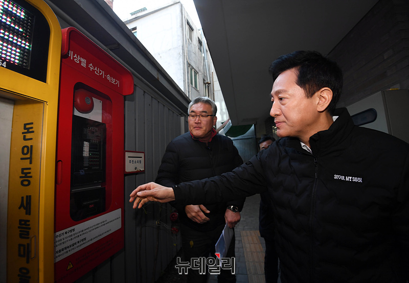 오세훈 서울시장이 18일 오전 서울 종로구 돈의동 쪽방촌을 찾아 한파 대비 현장점검을 하고 있다.