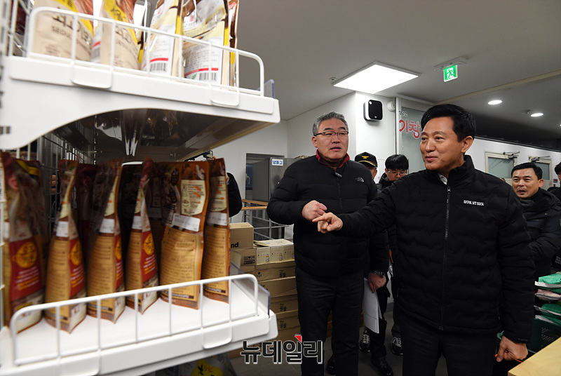 한파 대비 쪽방촌 현장 점검에 나선 오세훈 서울시장이 18일 오전 서울 종로구 돈의동 쪽방촌 온기창고에서 동계용품 및 화재예방 용품 등을 살펴보고 있다.