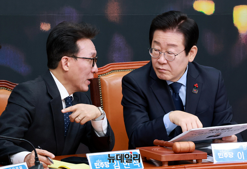 이재명 더불어민주당 대표가 18일 오전 국회에서 열린 최고위원회의에 참석해 김민석 최고위원과 대화를 나누고 있다.