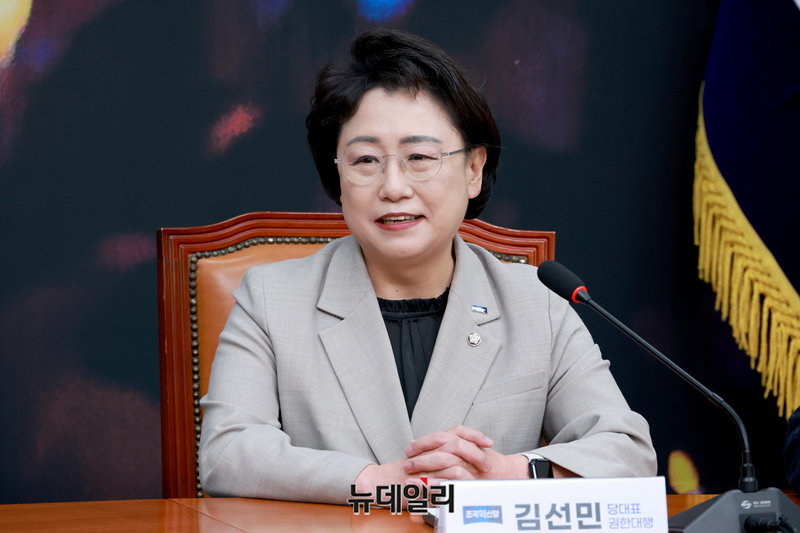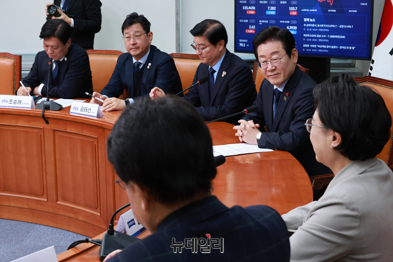이재명 더불어민주당 대표와 김선민 조국혁신당 대표 권한대행이 18일 오전 국회에서 만나 환담을 나누고 있다.