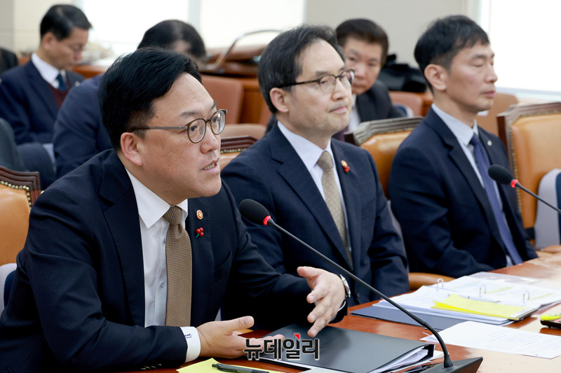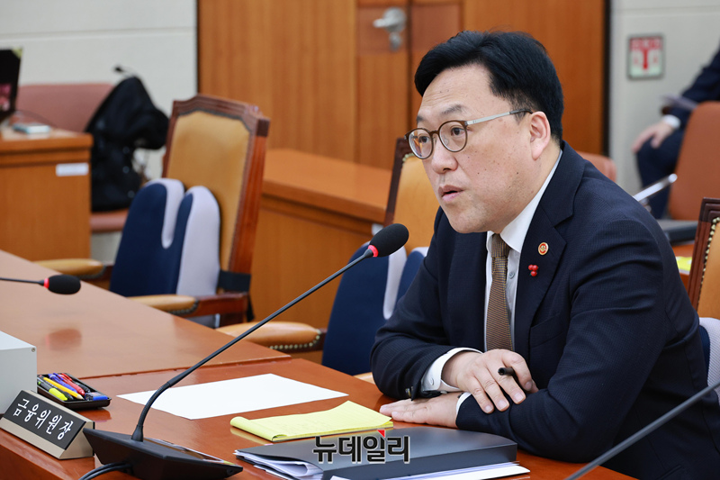 김병환 금융위원장이 18일 오전 국회에서 열린 정무위원회 전체회의에서 의원질의에 답하고 있다.