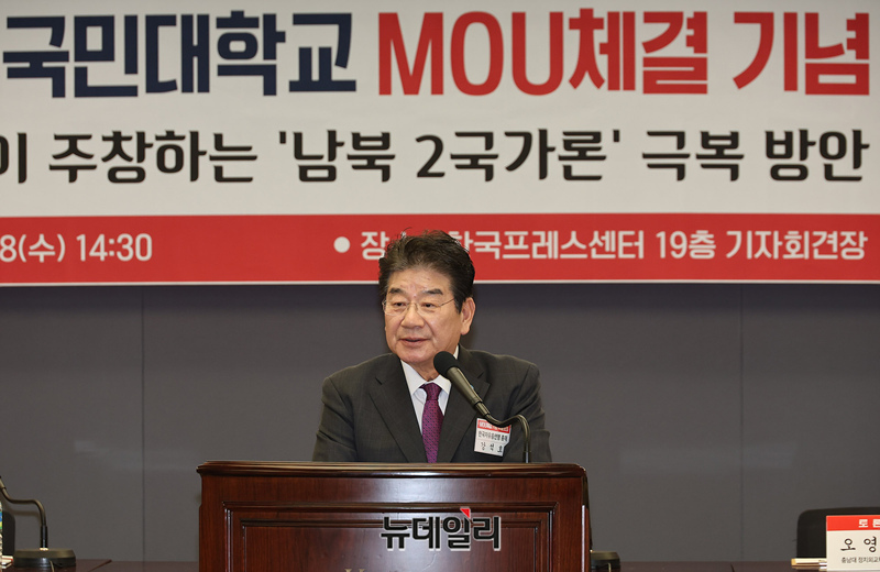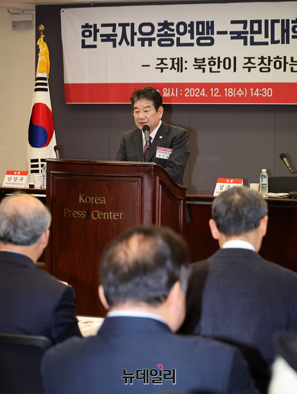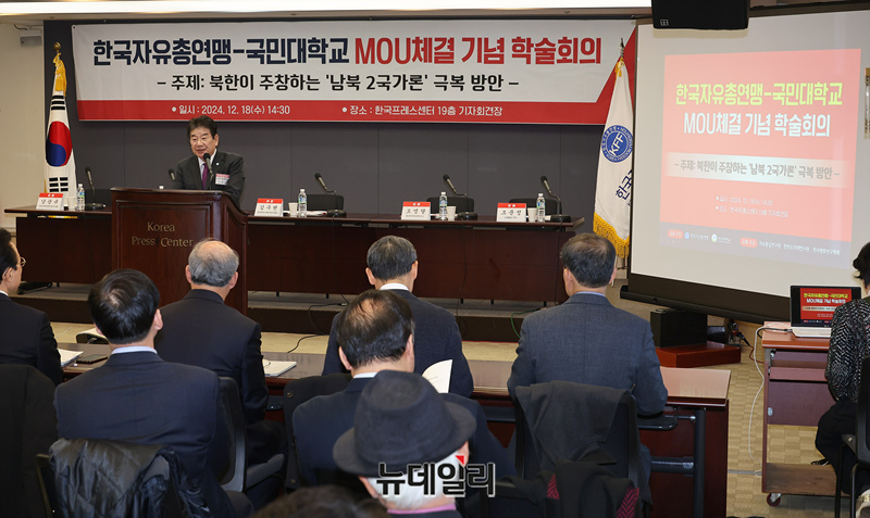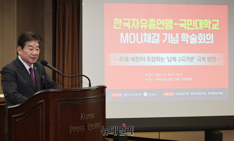 강석호 한국자유총연맹 총재가 18일 오후 서울 중구 한국프레스센터에서 열린 한국자유총연맹-국민대학교 MOU체결 기념 학술회의에서 인사말을 하고 있다.