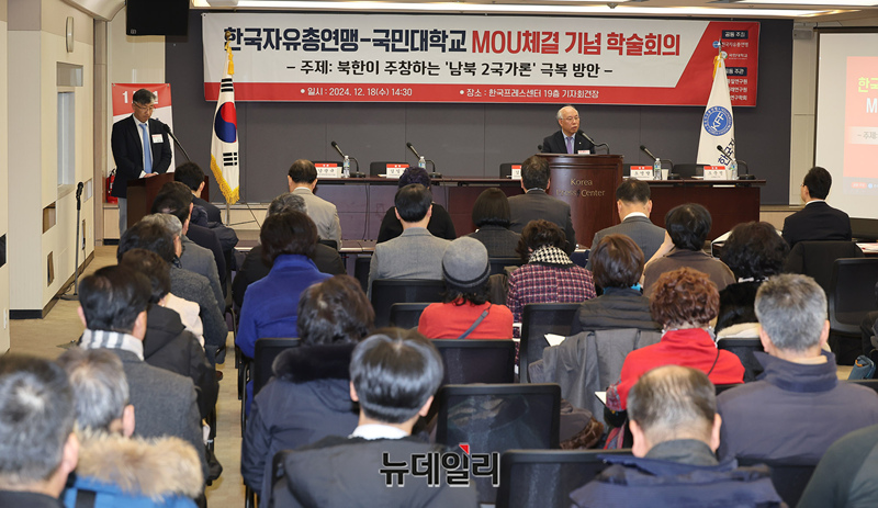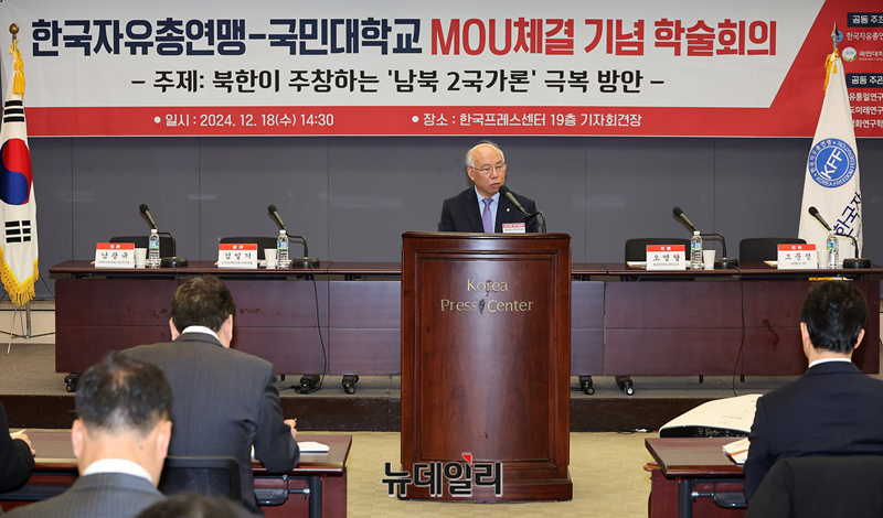 김형진 국민대 한반도미래연구원장이 18일 오후 서울 중구 한국프레스센터에서 열린 한국자유총연맹-국민대학교 MOU체결 기념 학술회의에서 인사말을 하고 있다.