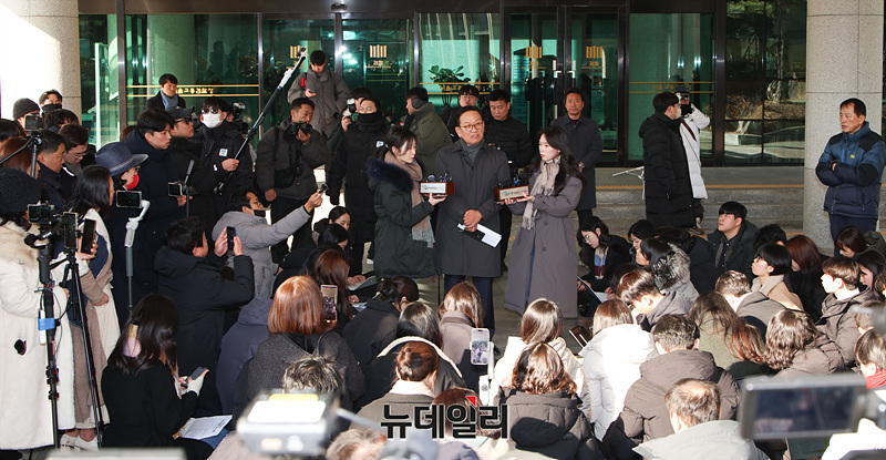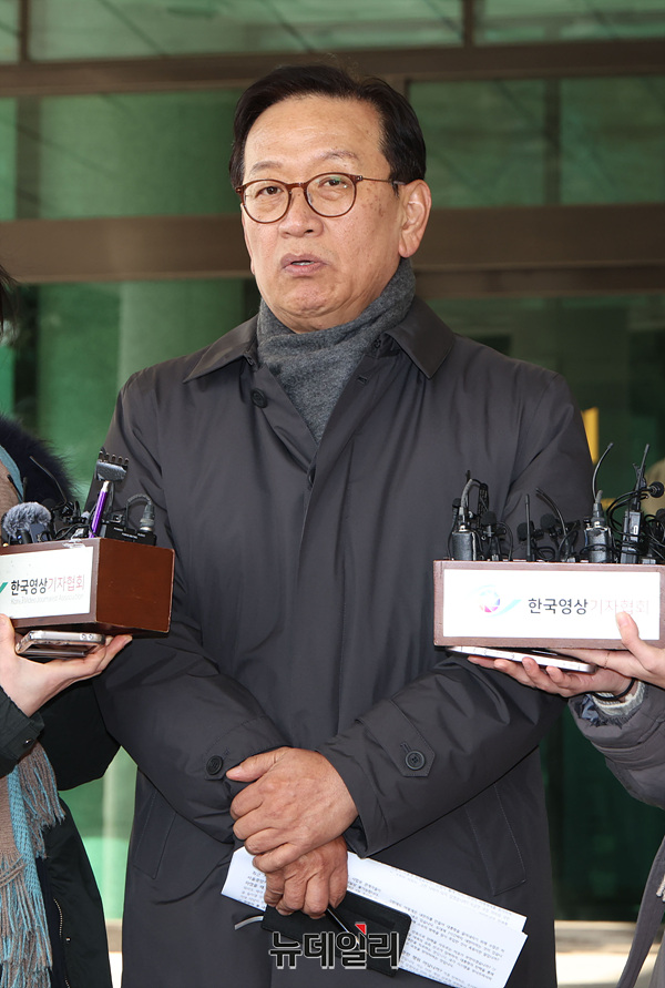 윤석열 대통령의 변호인단 구성에 참여한 석동현 변호사가 19일 오후 서울 서초구 서울고등검찰청 앞에서 기자회견을 갖고 입장을 밝히고 있다.