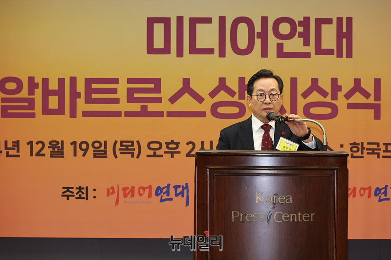 황우섭 미디어연대 상임대표가 19일 오후 서울 중구 한국프레스센터에서 열린 미디어연대 '2024 알바트로스상' 시상식에서 인사말을 하고 있다.올해 알바트로스상은 △이성복(뉴데일리 대표이사) △오정환(전 MBC노동조합 비대위원장) △김윤덕(조선일보 선임기자) 특별상에는 △황병구(미주한인상공회의소총연합회 명예회장)이 수상했다.알바트로스상은 미디어연대가 미디어를 포함한 사회 각 분야에서 탁월한 역할을 수행한 인물에게 수여하는 상으로 2022년부터 시상하고 있다.