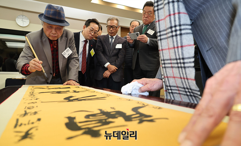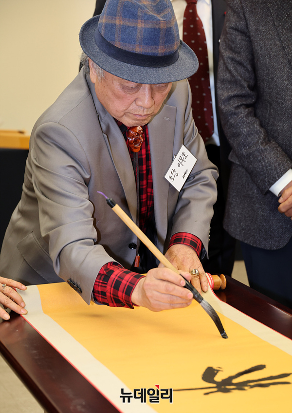 초당 이무호 서예가가 19일 오후 서울 중구 한국프레스센터에서 열린 미디어연대 '2024 알바트로스상' 시상식에서 특별상을 수상한 황병구 명예회장에게 휘호를 전달하고 있다.올해 알바트로스상은 △이성복(뉴데일리 대표이사) △오정환(전 MBC노동조합 비대위원장) △김윤덕(조선일보 선임기자) 특별상에는 △황병구(미주한인상공회의소총연합회 명예회장)이 수상했다.알바트로스상은 미디어연대가 미디어를 포함한 사회 각 분야에서 탁월한 역할을 수행한 인물에게 수여하는 상으로 2022년부터 시상하고 있다.