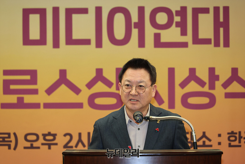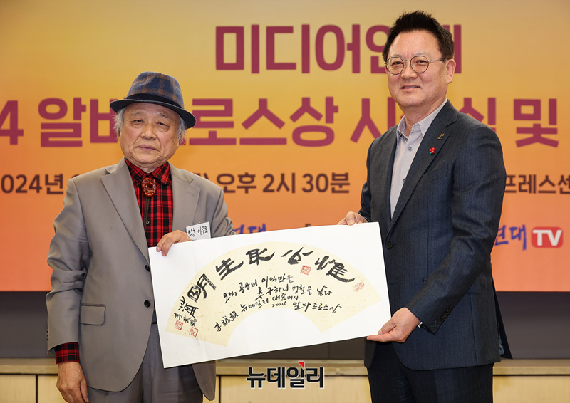 이성복 뉴데일리 대표이사가 19일 오후 서울 중구 한국프레스센터에서 열린 미디어연대 '2024 알바트로스상' 시상식에서 황우섭 미디어연대 상임대표와 기념촬영을 하고 있다.올해 알바트로스상은 △이성복(뉴데일리 대표이사) △오정환(전 MBC노동조합 비대위원장) △김윤덕(조선일보 선임기자) 특별상에는 △황병구(미주한인상공회의소총연합회 명예회장)이 수상했다.알바트로스상은 미디어연대가 미디어를 포함한 사회 각 분야에서 탁월한 역할을 수행한 인물에게 수여하는 상으로 2022년부터 시상하고 있다.