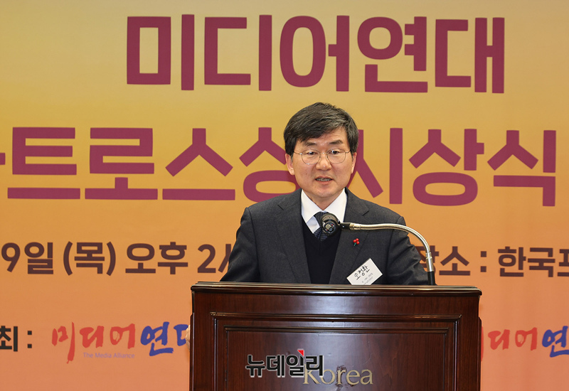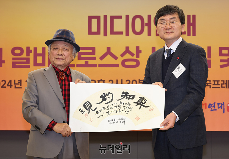 오전환 전 MBC노조 비대위원장이 19일 오후 서울 중구 한국프레스센터에서 열린 미디어연대 '2024 알바트로스상' 시상식에서 황우섭 미디어연대 상임대표와 기념촬영을 하고 있다.올해 알바트로스상은 △이성복(뉴데일리 대표이사) △오정환(전 MBC노동조합 비대위원장) △김윤덕(조선일보 선임기자) 특별상에는 △황병구(미주한인상공회의소총연합회 명예회장)이 수상했다.알바트로스상은 미디어연대가 미디어를 포함한 사회 각 분야에서 탁월한 역할을 수행한 인물에게 수여하는 상으로 2022년부터 시상하고 있다.