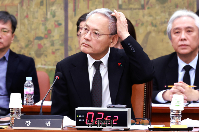 유인촌 문화체육관광부 장관이 20일 오전 국회에서 열린 문화체육관광위원회 전체회의에서 회의 시작을 기다리고 있다.