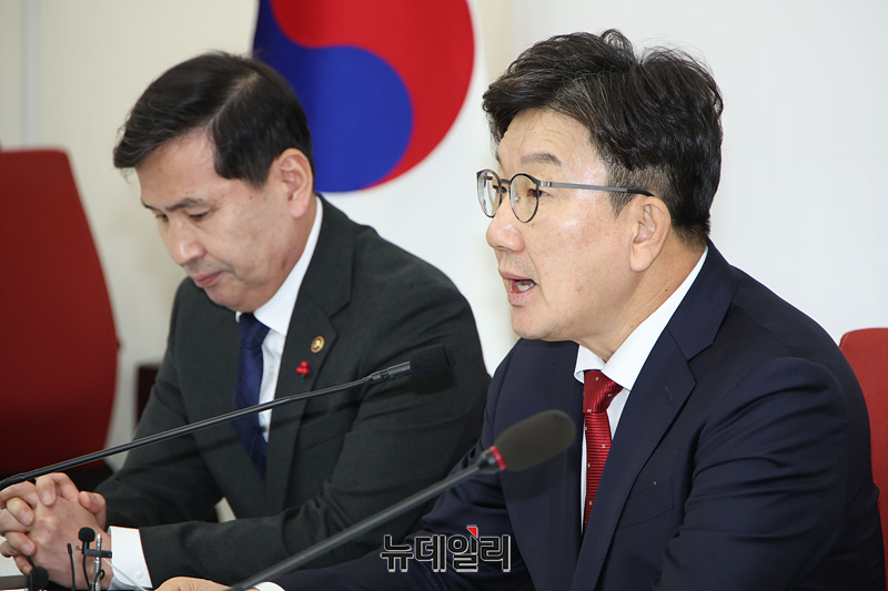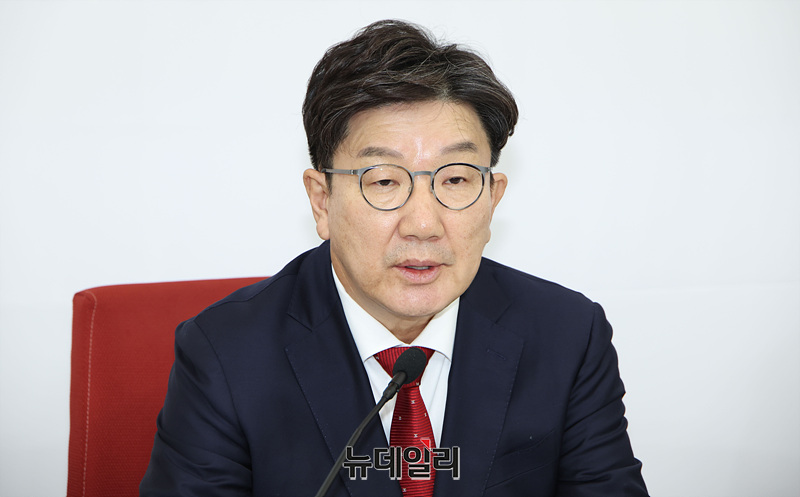권성동 국민의힘 당대표 권한대행 겸 원내대표가 23일 오후 서울 여의도 국회 원내대표실에서 인사말을 하고 있다.