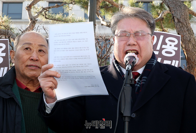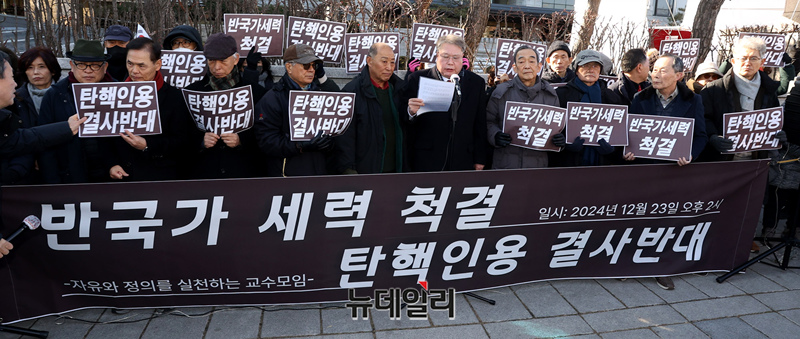 전국 전·현직 대학교수로 구성된 자유와정의를실천하는교수모임이 23일 오후 서울 종로구 헌법재판소 앞에서 윤석열 대통령의 탄핵인용을 반대하는 시국 선언을 하고 있다.