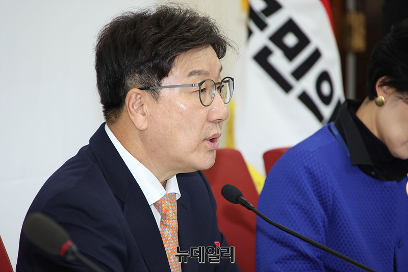 권성동 국민의힘 당대표 권한대행 겸 원내대표가 26일 오전 서울 여의도 국회 원내대표 회의실에서 미즈시마 고이치 주한일본대사와 만나 인사말을 하고 있다.