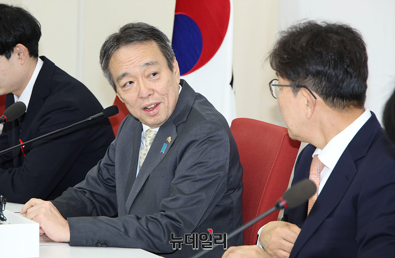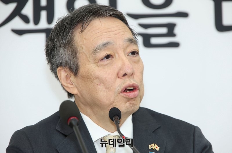 미즈시마 고이치 주한일본대사가 26일 오전 서울 여의도 국회 국민의힘 원내대표 회의실에서 권성동 권한대행을 만나 인사말을 하고 있다.