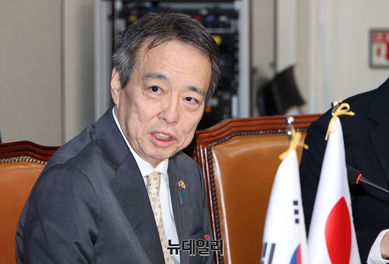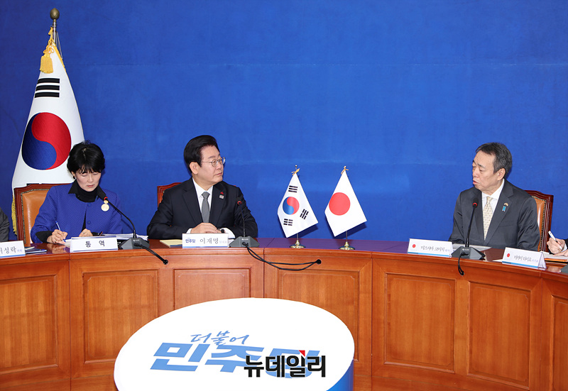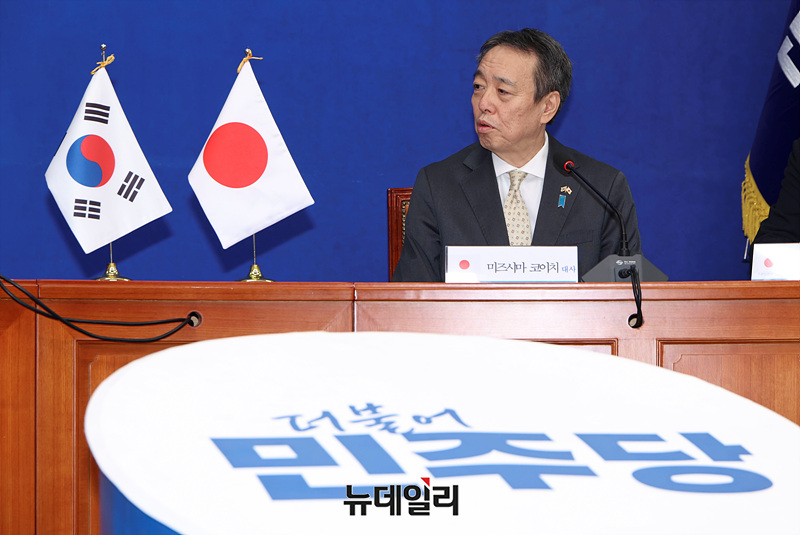 미즈시마 고이치 주한일본대사가 26일 오전 서울 여의도 국회 더불어민주당 당대표 회의실에서 이재명 대표와 만나 인사말을 하고 있다.