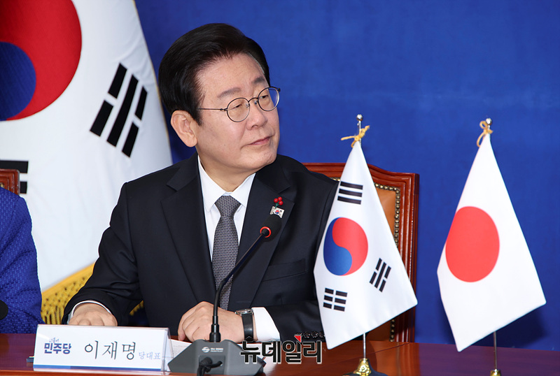 이재명 더불어민주당 대표가 26일 오전 서울 여의도 국회 당대표 회의실에서 미즈시마 고이치 주한일본대사와 만나 자리하고 있다.