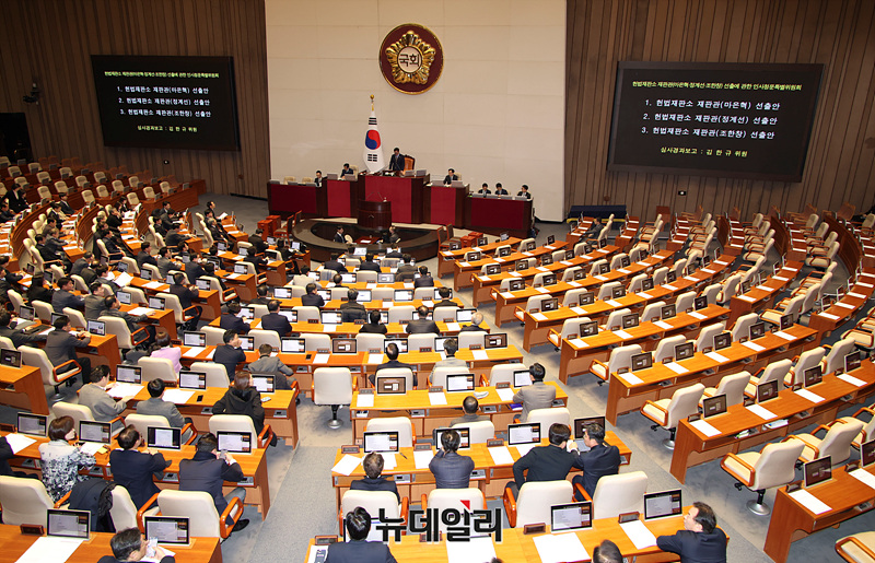 여당 의원 대부분이 표결에 반대하며 불참한 가운데 26일 오후 서울 여의도 국회에서 열린 본회의에서 헌법재판소 재판관 3인 선출안 표결이 진행되고 있다.