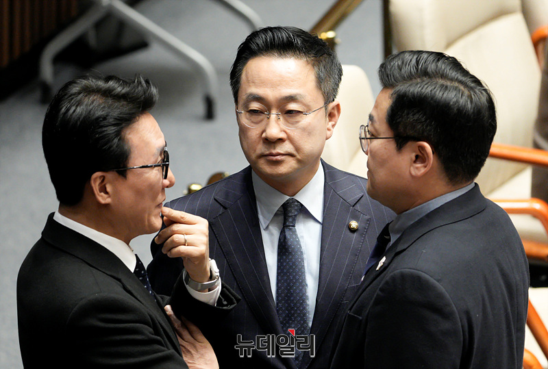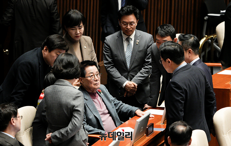 더불어민주당 의원들이 26일 오후 서울 여의도 국회에서 열린 본회의에서 대화를 나누고 있다.