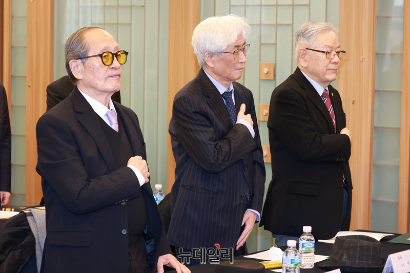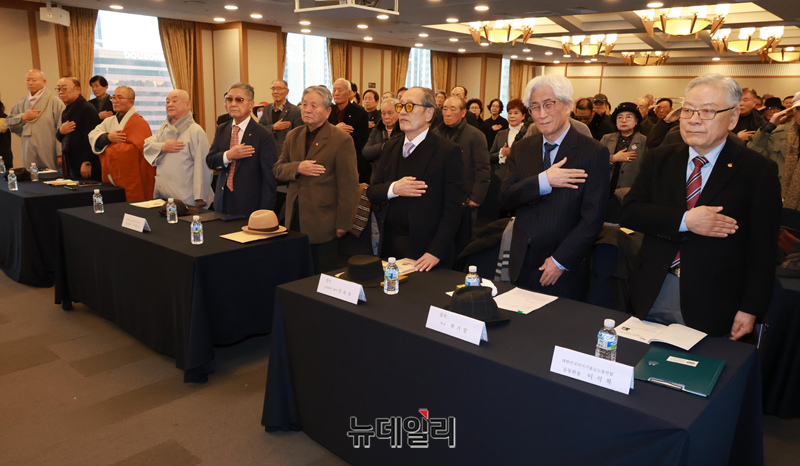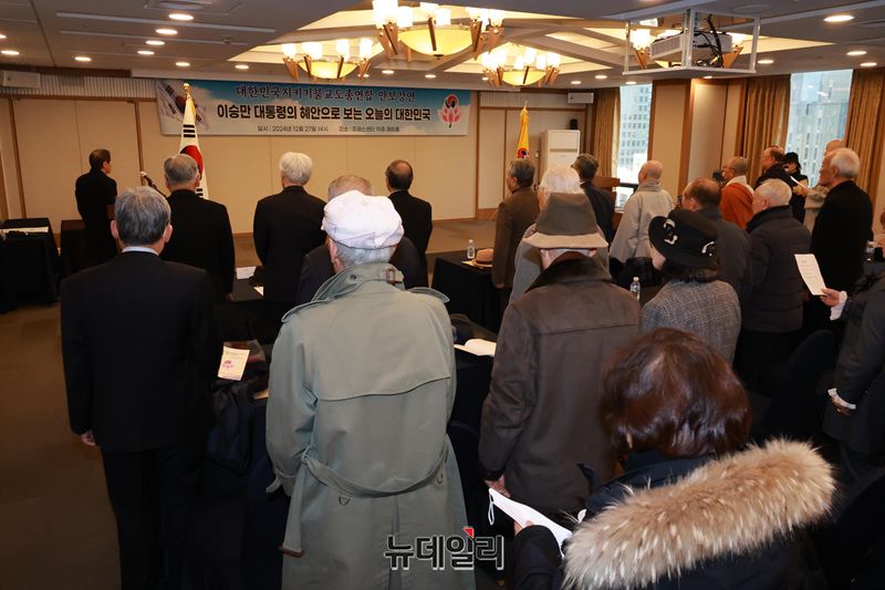 '이승만 대통령의 혜안으로 보는 오늘의 대한민국' 안보특강이 27일 오후 서울 중구 한국프레스센터에서 열린 가운데 참석자들이 국민의례를 하고 있다.