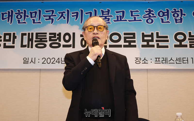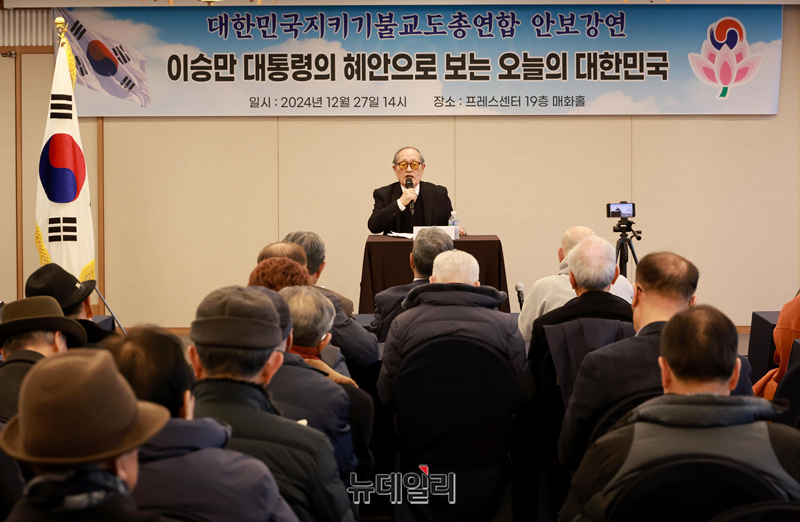 '이승만 대통령의 혜안으로 보는 오늘의 대한민국' 안보특강이 27일 오후 서울 오후 서울 중구 한국프레스센터에서 열린 가운데 인보길 뉴데일리 회장이 '이승만이 살아 계신다면'을 주제로 강연을 하고 있다.이날 행사는 대한민국지키기불교도총연합 주최로, 이승만 대통령의 기념관 건립 계획에 즈음하여 대한민국의 건국과 자유민주주의 체제 확립의 기적을 이룬 이승만 대통령의 정신과 시대적 선각자로서의 면모를 부각시킴으로써 한국인의 자부심을 드높이기 위해 마련됐다.
