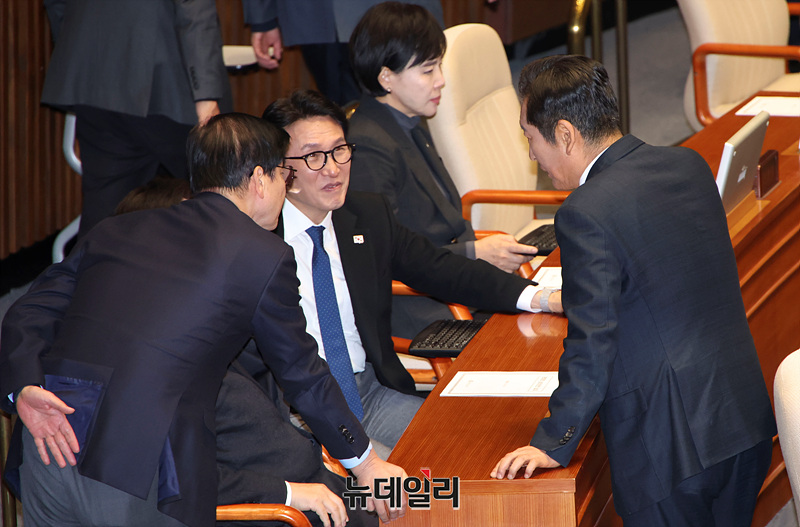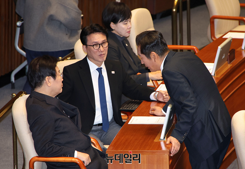 이재명 더불어민주당 대표와 의원들이 27일 오후 서울 여의도 국회에서 열린 본회의에서 대화를 나누고 있다.