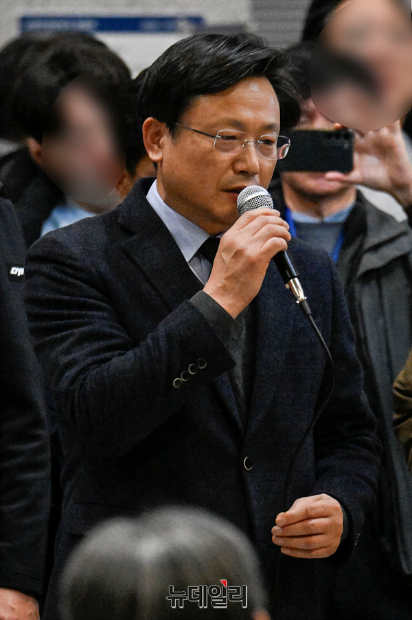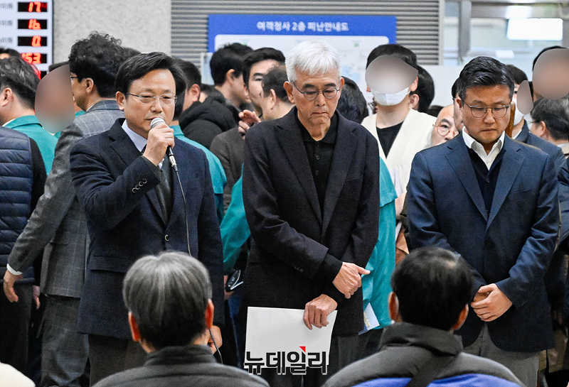 전남 무안국제공항에 착륙 중이던 제주항공 여객기가 항행 안전시설에 부딪히면서 탑승자 대부분이 사망하는 참사가 발생한 가운데 29일 오후 김이배 제주항공 대표이사가 무안공항 여객터미널에서 유가족들을 만나 사과하고 있다. (전남 무안=서성진 기자)