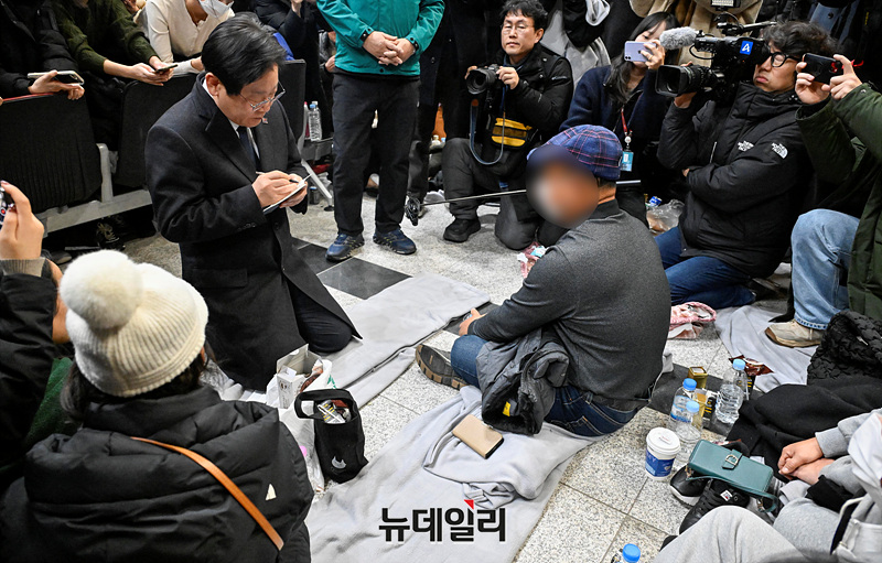 전남 무안국제공항에 착륙 중이던 제주항공 여객기가 항행 안전시설에 부딪히면서 탑승자 대부분이 사망하는 참사가 발생한 가운데 29일 오후 이재명 더불어민주당 대표가 유가족들을 찾아 위로하고 있다. (전남 무안=서성진 기자)