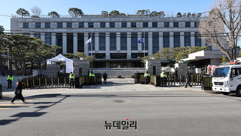 윤석열 대통령의 탄핵심판을 비롯한 국무위원들의 탄핵심판 일정이 줄줄이 잡혀있는 31일 서울 종로구 헌법재판소에 무안공항 참사로 인해 조기가 게양돼 있다.
