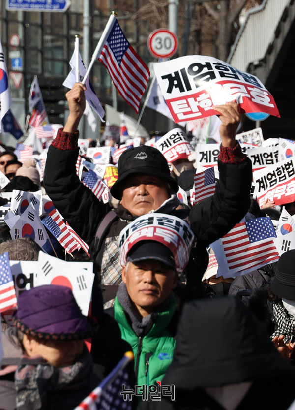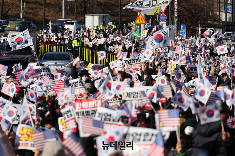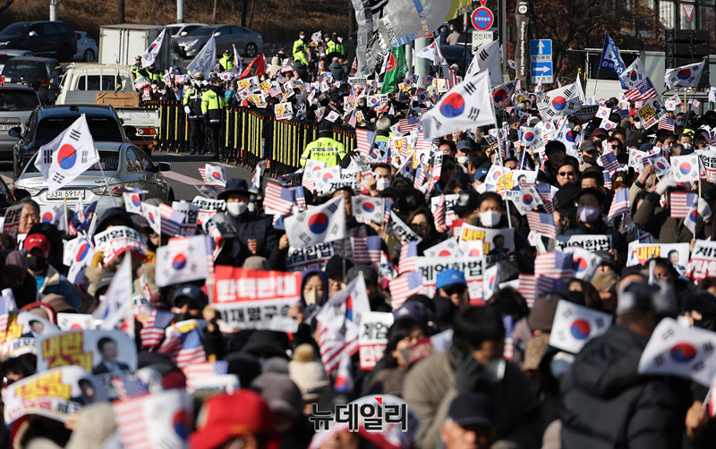 윤석열 대통령에 대한 체포영장이 발부된지 사흘째인 2일 오후 서울 용산구 대통령 관저 입구에 윤 대통령을 지지하는 시민들이 '탄핵무효'를 외치고 있다. 공수처는 체포영장 유효기간인 6일까지 집행을 이어간다는 방침이다.