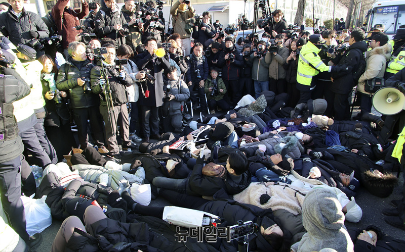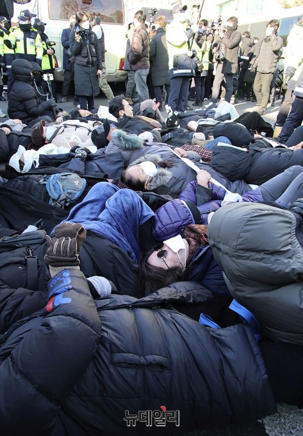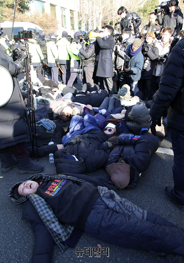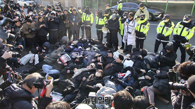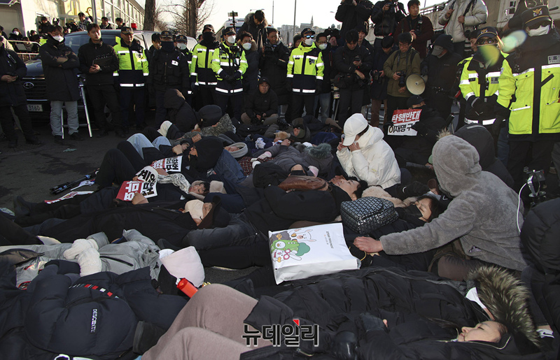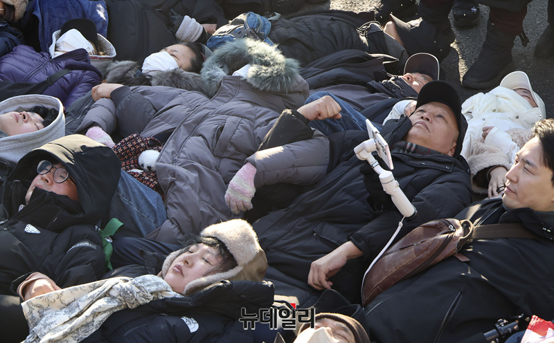 윤석열 대통령에 대한 체포영장이 발부된지 사흘째인 2일 오후 서울 용산구 한남동 대통령 관저 입구에 공수처의 체포영장 집행이 가까워지자 시민들이 바닥에 누워 출입을 막고 있다. 공수처는 체포영장 유효기간인 6일까지 집행을 이어간다는 방침이다.