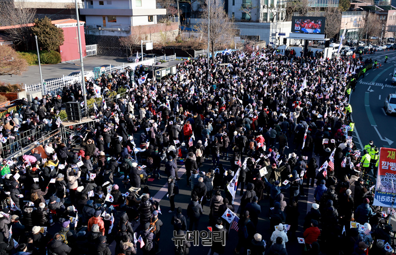 윤석열 대통령에 대한 체포영장이 발부된지 사흘째인 2일 오후 서울 용산구 한남동 대통령 관저 입구에 윤 대통령을 지지하는 시민들이 탄핵무효를 주장하며 집회를 하고 있다. 공수처는 체포영장 유효기간인 6일까지 집행을 이어간다는 방침이다.