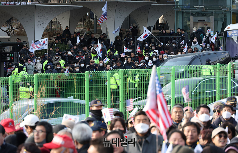 고위공직자범죄수사처(공수처)가 헌정 사상 최초로 현직 대통령에 대한 체포·수색영장 집행에 나선 3일 오후 서울 용산구 한남동 대통령 관저 앞에서 윤 대통령 지지자들이 체포조의 퇴각 소식에 태극기와 성조기를 흔들고 있다.