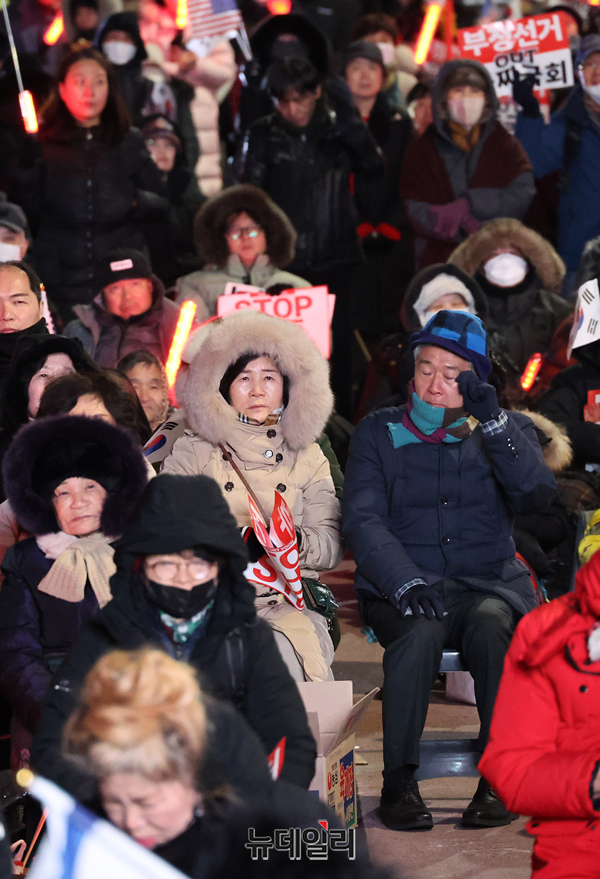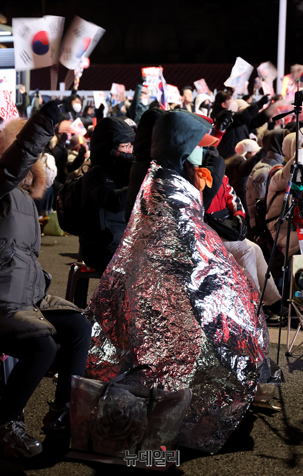 [포토] 눈내리는 밤까지 관저 앞 지키는 윤 대통령 지지자들