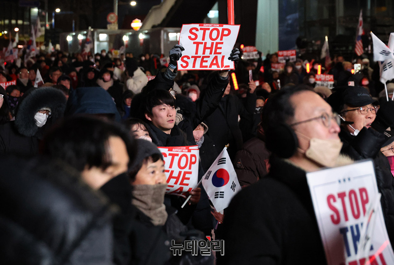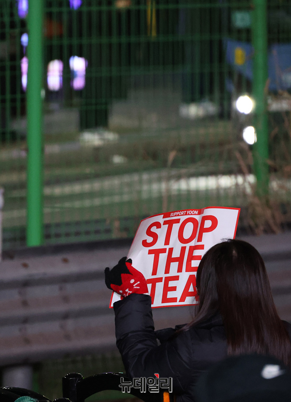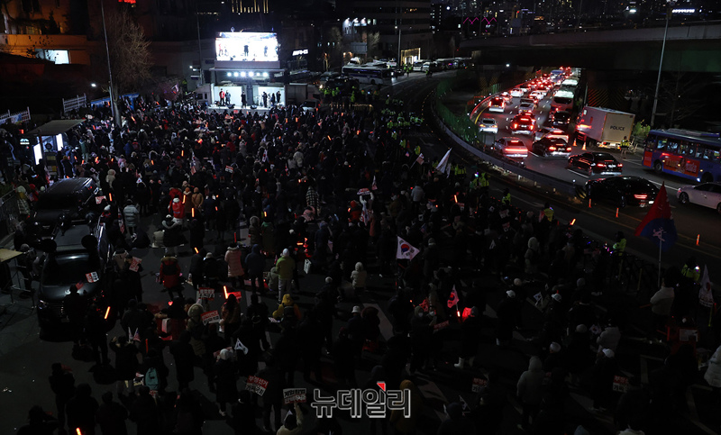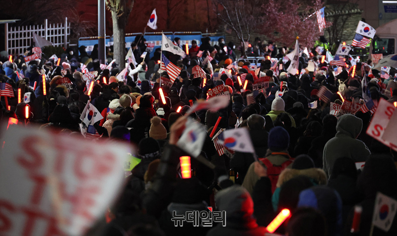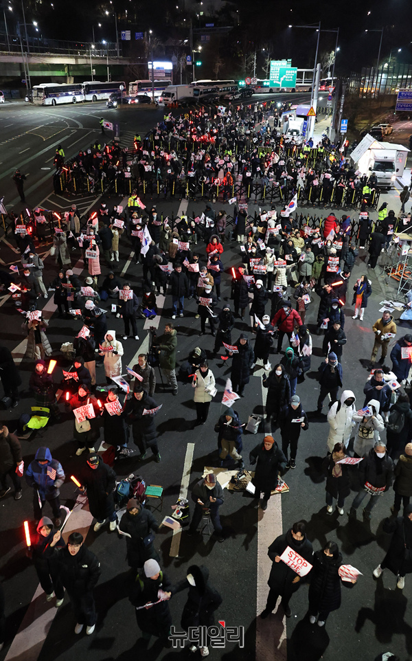 고위공직자범죄수사처(공수처)가 헌정 사상 최초로 현직 대통령에 대한 체포·수색영장 집행에 나선 3일 밤 서울 용산구 한남동 대통령 관저 앞에서 윤 대통령 지지자들이 밤샘집회에 참석해 자리하고 있다.