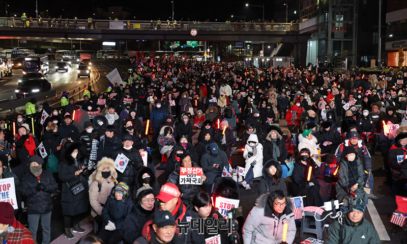 고위공직자범죄수사처(공수처)가 헌정 사상 최초로 현직 대통령에 대한 체포·수색영장 집행에 나선 3일 밤 서울 용산구 한남동 대통령 관저 앞 육교에 집회에 참석한 시민들이 줄을 서서 이동하고 있다.관저 앞 육교가 흔들린다는 제보를 받은 용산구는 이날 오후 '안전상 문제가 없다'는 안내 현수막을 육교 곳곳에 설치하고 안내담당자를 배치해 안전사고에 대비했다.이날 오전 윤 대통령 체포영장 집행에 나선 공수처는 약 5시간 30분 만에 체포영장 집행을 중지하고 철수했다.