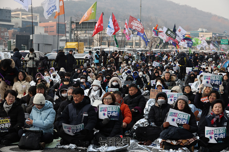윤석열 대통령의 체포영장 유효기간 만료일인 6일 오후 서울 용산구 한남동 대통령 관저 인근에서 열린 민노총 윤 체포집회에서 양경수 민노총위원장과 김재연(전 통합진보당) 진보당 대표가 참석해 자리하고 있다.
