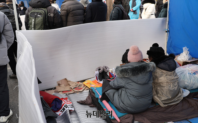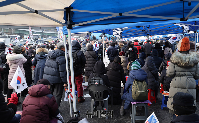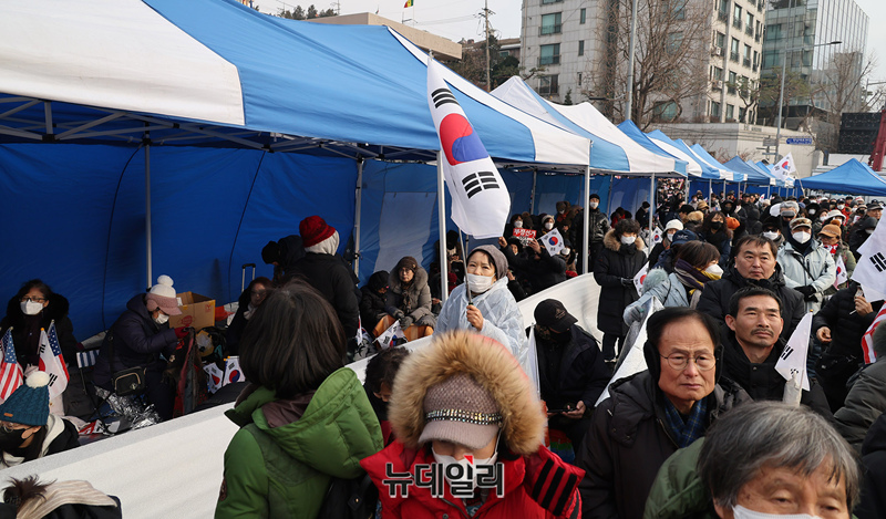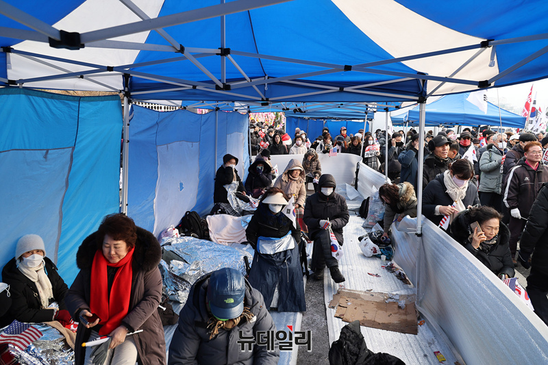 윤석열 대통령의 체포영장 유효기간 만료일인 6일 오후 서울 용산구 한남동 대통령 관저 인근에서 열린 윤 대통령 응원집회에 비·추위 막음 천막이 설치돼 참가자들이 이용하며 집회에 참가하고 있다.