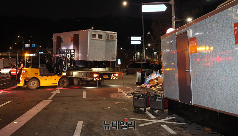 윤석열 대통령의 체포영장 유효기간 만료일인 6일 밤 서울 용산구 한남동 대통령 관저 인근에서 며칠째 진행된 탄핵반대 집회에 사용된 간이화장실이 철거되고 있다.