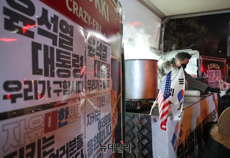 윤석열 대통령의 체포영장 유효기간 만료일인 6일 밤 서울 용산구 한남동 대통령 관저 인근 한남초등학교에서 푸드트럭이 참가자를 위해 어묵을 준비하고 있다. 이날 집회에는 일부 유튜버들이 자비로 마련한 푸드트럭이 곳곳에 배치됐다.루터교회 앞에서 며칠째 이어진 집회장소는 이날 무대차량과 음향차량이 대부분 철수 했다. 남은 참가자들은 한남초등학교 정문으로 이동해 집회를 이어갔다.인근에서 민노총 주도로 열린 윤 체포집회도 이날 오후 4시께 자진해산했다. 민노총은 이번 주말 집회를 다시 개최할 예정이다.
