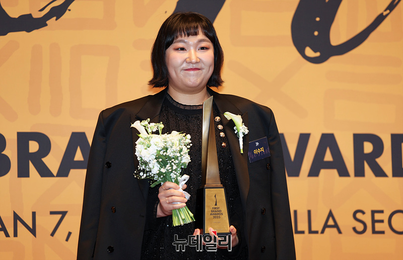 코미디언 이수지가 7일 오전 서울 중구 신라호텔에서 열린 '2025 대한민국 퍼스트브랜드 대상 시상식' 포토월에서 포즈를 취하고 있다.